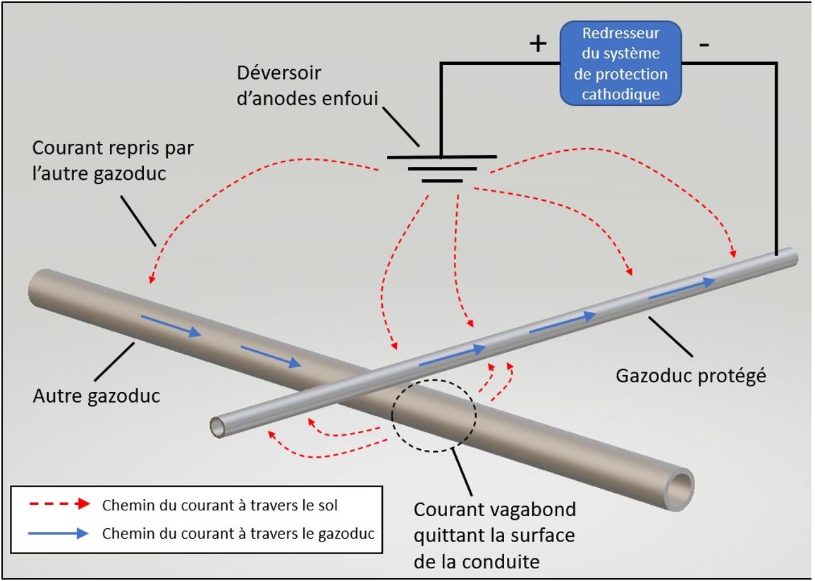 Dans les zones où plusieurs gazoducs sont situés à proximité les uns des autres, comme dans le cas de l’événement à l’étude, il peut se produire des interactions entre les systèmes de protection cathodique. Le courant fourni par le redresseur d’un système peut être capté par d’autres gazoducs situés à proximité. Le courant se déplace alors dans le sol d’un gazoduc à l’autre sur son chemin de retour vers le redresseur. Le sol de la zone à l’étude présentait une faible résistivité, ce qui offrait au courant un chemin à travers le sol.