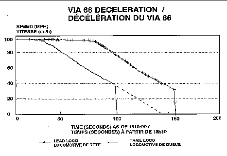 Une simulation par ordinateur a révélé que, dans des conditions idéales, un train constitué d'éléments semblables, roulant à 96 mi/h sur une voie à alignement droit, devrait, quand on serre les freins de la même façon que lors de l'événement mettant en cause le VIA 66, s'arrêter en l'espace de 38 secondes et parcourir une distance d'environ 3 000 pieds, selon un taux de décélération relativement fixe.