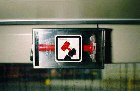 Les portes automatiques de corridor ont été dotées de deux plaques de commande, une qui se trouve à environ 4 pieds (1,2 m) au-dessus du plancher, sur laquelle on appuie avec la main pour commander l'ouverture de la porte, et l'autre, à environ 1 pied (0,3 m) du plancher, sur laquelle on appuie avec le pied pour commander l'ouverture de la porte. Lorsqu'on appuie sur l'une ou l'autre des plaques, la porte glisse à l'intérieur de la cloison.