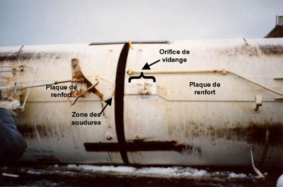 - La rupture du wagon UTLX 15076 est attribuable à la présence d'une fissure de fatigue qui existait déjà dans la zone touchée par la chaleur de deux cordons de soudure imparfaits (soudures d'angle), dans un écart entre l'orifice de vidange et la plaque de renfort.