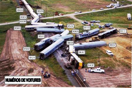 La tête du train s'est immobilisée à environ 180 m du contre-rail qui a été heurté; les deux locomotives étaient couchées sur le côté gauche et les 13 premières voitures s'étaient immobilisées hors des rails sous différents angles et différents axes. Les six autres voitures du train n'ont pas déraillé.
