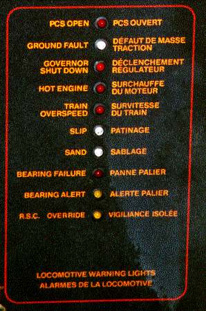 Le 1er méc. s'est d'abord rendu dans la cabine de la deuxième locomotive (6437), puis dans celle de la troisième locomotive (6447) où un voyant lumineux était allumé sur le tableau des voyants lumineux d'alarme de la console supérieure. Sans ses lunettes, il était incapable de lire l'inscription près du voyant. Il a donc appelé par radio le deuxième mécanicien (2e méc.) et celui-ci, d'après la description fournie, a conclu que le voyant allumé était celui qui correspondait à l'indication « Alerte palier » du tableau (Figure 3).