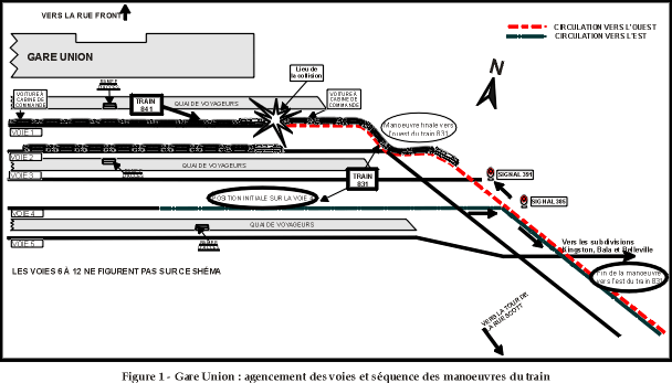 Le train de banlieue no 831 (train 831), qui doit arriver sur la voie no 1 de la gare Union à 16 h 16, n'a aucun voyageur à son bord et est immobilisé sur la voie no 4. Vers 16 h 10, le train 831 se dirige vers l'est pour quitter la voie no4 et s'arrête après avoir franchi les signaux no391 et no 385 (Figure 1). Le train passe plusieurs minutes à cet endroit à attendre que le chef du mouvement des trains (CMT) de la tour de la rue Scott change les aiguillages pour que le train puisse se diriger vers l'ouest pour passer sur la voie no1. Voyant les signaux passer du rouge au jaune, le chef de train qui se trouve dans la voiture de tête d'où il commande le train trouve que la voie no 1 semble dégagée. Vers 16 h 14, le chef de train informe le premier mécanicien, par l'interphone, que les signaux ont changé et que le train peut s'engager en marche arrière sur la voie no1. Les deux membres de l'équipe ne parlent ni des signaux ni de la distance à parcourir en marche arrière. Le premier mécanicien engage le train sur la voie no 1. Pendant que le train se déplace lentement, le premier mécanicien communique avec le chef de train par l'interphone, et ils discutent brièvement de l'endroit précis où il va falloir arrêter le train sur la voie no 1. Le chef de train a déclaré que, pendant le déplacement du train vers l'ouest sur la voie no 1, il avait retiré son manteau, s'était assis dans la voiture à cabine de commandeNote de bas de page 2, avait branché la cloche et diminué l'éclairage. Alors que le train s'approche des quais, le chef de train observe un train immobilisé sur la voie no 1, à quelque 200 pieds de là.