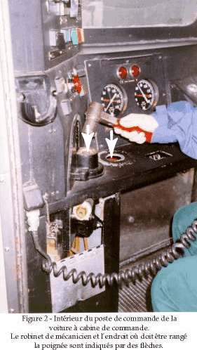 Le poste de commande se trouve dans une petite cabine à l'une des extrémités de la voiture à cabine de commande. Cette dernière est placée à la queue du train. Le poste de commande est équipé d'une console à partir de laquelle un membre de l'équipe peut assurer la conduite du train. Il y a un robinet de mécanicien dans le poste de commande. Les instructions d'exploitation locales exigent que la poignée du robinet de mécanicien soit enlevée et rangée sur la console quand la conduite du train passe de la voiture à cabine de commande à la locomotive (Figure 2).