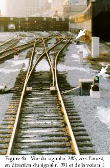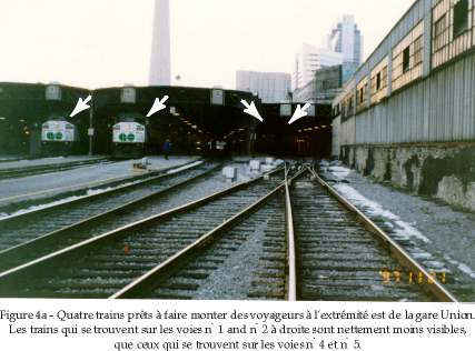 Sur les voies no 1 et no 2, les trains s'immobilisent de manière à ce que l'embarquement se fasse plus à l'ouest (Figures 4a et 4b). Lorsqu'un train se trouve à son emplacement sur la voie no 1 ou sur la voie no 2, l'avant de la locomotive est en retrait de 160 pieds par rapport à l'extrémité est des trains qui se trouvent sur les autres voies, dont 100 pieds sont couverts par l'abri. Le jour, les trains immobilisés sur les voies no 1 et no 2 sont difficiles à voir; par contre, on peut voir l'avant de la locomotive des trains du réseau GO qui sont sur les autres voies.