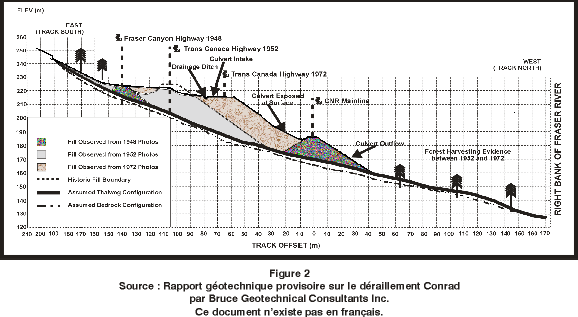 Dans le rapport sur l'étude géotechnique préparé par M. Stephen G. Evans (ingénieur géotechnicien et ingénieur-géologue pour la Commission géologique du Canada), conseiller auprès du Bureau de la sécurité des transports du Canada, et par M. K. Wayne Savigny, ingénieur, géologue (ingénieur géotechnicien et ingénieur-géologue pour la firme d'experts-conseils Bruce Geotechnical Consultants Inc. de Vancouver), expert-conseil pour le CN, on a conclu que le déraillement s'est produit après une longue période (pouvant aller jusqu'à 41 jours) au cours de laquelle la quantité des eaux de ruissellement saisonnières n'a cessé d'augmenter à la suite de la fonte d'une accumulation de neige particulièrement abondante. Des observations faites sur les lieux le 26 mars 1997 ont indiqué que les eaux de ruissellement en provenance de rigoles se trouvant directement au-dessus du lieu du glissement s'étaient infiltrées dans l'ancien remblai de la route et dans le remblai actuel avant d'atteindre le tuyau de drainage en bordure de la route transcanadienne actuelle. Cette infiltration soutenue a créé une nappe phréatique qui allait d'un bord à l'autre du remblai de la route. À la suite de l'élaboration de l'infrastructure routière dans la région de Conrad, le talus de la route transcanadienne s'est continuellement rapproché de l'emprise du CN jusqu'à ce qu'en 1960, on construise le talus de la route transcanadienne directement contre le remblai existant du CN, créant pour la première fois la possibilité physique d'un écoulement continu de la nappe d'eau souterraine de part et d'autre des remblais et d'une augmentation soutenue des pressions d'eau interstitielle dans le remblai du CN existant. L'événement du 26 mars 1997 met en cause deux glissements. Dans un premier temps, un petit glissement centré au nord de la principale niche d'arrachement a été causé par un affaissement du remblai du côté ouest de la voie d'évitement et a entraîné le déraillement du train qui transportait du soufre (train 711). Le deuxième glissement, beaucoup plus important, a été amorcé par le premier mais a rétrogradé vers la rigole gonflée d'eau au lieu de se joindre aux décharges du premier glissement. Les deux glissements ont été causés par une augmentation de la pression d'eau. L'étendue de la rétrogradation des glissements est reliée au niveau de la nappe phréatique et au degré de compactage du remblai d'origine de la voie ferrée.