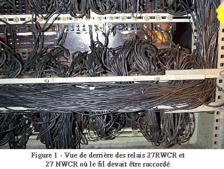 Lors de l'installation, le coordonnateur des installations du S & C a donné les instructions quant à l'origine et la destination du fil en question. Par contre, il ne se souvient pas s'il a nommé le relais par son nom ou sa place dans l'étagère. L'apprenti a fait le raccordement à l'arrière de l'étagère. Il a raccordé le fil dans la borne 12F du relais 27NWCR, le relais juste à côté du relais 27RWCR, dans lequel il aurait dû être raccordé (voir les figures 2 et 3).