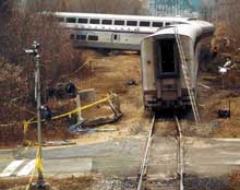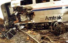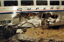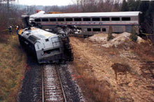 Les données du consignateur d'événements de la locomotive indiquent que le train roulait à 63 mi/h quand un freinage d'urgence a été déclenché. Il roulait à environ 60 mi/h au moment de l'impact. Le train a déraillé du côté nord, a heurté un talus élevé, puis la locomotive s'est renversée sur le flanc gauche, a pivoté de 180 degrés pour s'immobiliser à 395 pieds à l'ouest du passage à niveau. Avant de finir sa course, la locomotive avait perdu ses deux bogies. L'examen des bogies et du châssis a révélé que les brides des appuis latéraux s'étaient détachés du dessous la locomotive.