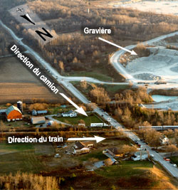 La photo 5 est une photographie aérienne des lieux prise suite à l'accident. Celui-ci s'est produit dans un milieu rural/résidentiel où il y a des maisons dans trois des quatre quadrants. Dans le quadrant sud-ouest, il y a un talus élevé qui empêche, à partir de 100 pieds au sud du passage à niveau, de voir venir les trains roulant vers l'est. Des arbres, des buissons et de la végétation cachent une gravière située à 360 pieds au sud du passage à niveau. Le côté ouest de la route en allant vers le sud est bordé d'arbres et de buissons sur environ 200 pieds, ainsi que la voie ferrée sur 500 pieds en direction ouest.