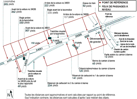 Le camion à benne, qui pesait quelque 34 tonnes avec son chargement, a été poussé vers l'ouest puis projeté du côté sud-ouest. Le châssis et la cabine du camion se sont renversés dans un fossé, à 120 pieds au sud de la voie et à 33 pieds à l'ouest du passage à niveau. La benne a été arrachée du châssis du camion et s'est retrouvée à 63 pieds à l'ouest du passage à niveau et à 15 pieds au sud de la voie ferrée. On a trouvé des pièces du camion éparpillées de part et d'autre de la voie jusqu'à une distance de 234 pieds du passage à niveau. L'Annexe A contient un diagramme montrant les lieux de l'accident ainsi que la position approximative des véhicules ainsi que les distances.