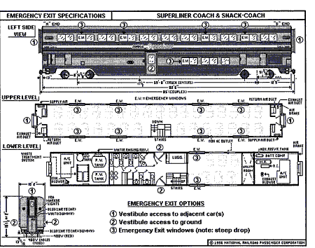 Les plates-formes, mesurant 9 pieds 3 pouces de large sur 3 pieds 9 pouces de profondeur, sont situées au milieu des voitures, les sièges se trouvant à chaque bout. Pour monter dans les voitures ou en descendre, les passagers passent par des portes à charnières à ouverture manuelle, de 2 pieds 9 pouces de large sur 6 pieds 2 pouces de haut, qui donnent sur la plate-forme. Tout juste à l'intérieur de la plate-forme, il y a une salle de toilette accessible aux fauteuils roulants munie de mains courantes, d'un lavabo, de toilette et d'une table à langer. La porte à charnières de la salle de toilette, de 2 pieds 6 pouces de large sur 6 pieds 2 pouces de haut, donne sur la plate-forme. Un étroit corridor, de 2 pieds 5 pouces de large, va de la plate-forme au compartiment de 12 passagers en passant par l'escalier menant au niveau supérieur et une aire de rangement des bagages. Il s'agit du seul accès à ce compartiment et au rangement des fauteuils roulants. Ce rangement mesure 3 pieds de large sur 5 pieds 7 pouces de long et peut recevoir quatre fauteuils roulants. Il semble qu'il n'y ait rien de prévu pour l'arrimage des fauteuils roulants à cet endroit. De l'autre côté de la plate-forme, un étroit corridor de 2 pieds 2 pouces de large mène à cinq petites salles de toilette, chacune munie d'un lavabo et de toilette. Les portes des toilettes mesurent 1 pied 6 pouces de large sur 6 pieds 3 pouces de haut et s'ouvrent vers l'intérieur. Au niveau supérieur il y a 31 sièges doubles.