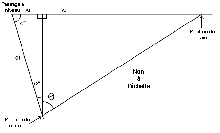 Les données et les calculs ci-après ont servi à déterminer les distances auxquelles le camion et le train se sont trouvés avant la collision, ainsi que la position du train dans le champ visuel du conducteur du camion pendant que ce dernier accélérait en direction du passage à niveau. Le camion s'est engagé sur la chaussée après avoir fait un arrêt complet (c'est-à-dire Vi = 0), à 360 pieds du passage à niveau. Le train s'est approché du passage à niveau à une vitesse constante de 63 mi/h. L'angle du passage à niveau était de 78 degrés, comme on peut le voir dans le diagramme ci-après. On pose deux hypothèses simplificatrices : en premier lieu, que l'accélération du camion a été constante et, en second lieu, que la vitesse du train a été constante (bien qu'au moment de la collision, le train ait ralenti à 60 mi/h après le serrage d'urgence des freins). Ces hypothèses modifient les résultats des calculs de quelques pieds, tout au plus.