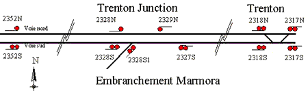La subdivision Kingston du CN va de Dorval (Québec), point milliaire 10,3, à Toronto (Ontario), point milliaire 333,8, et est constituée de deux à quatre voies principales reliées entre elles par des liaisons. La vitesse maximale est de 100 mi/h pour les trains de voyageurs et de 60 mi/h pour les trains de marchandises. De nombreux aiguillages à commande manuelle ou à double commande donnent accès aux voies principales ou aux embranchements, y compris à l'embranchement Marmora. L'embranchement Marmora part de la voie principale sud et entre dans la ville de Trenton, en direction sud.
