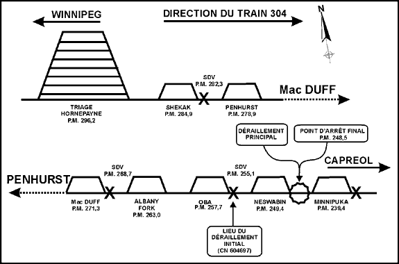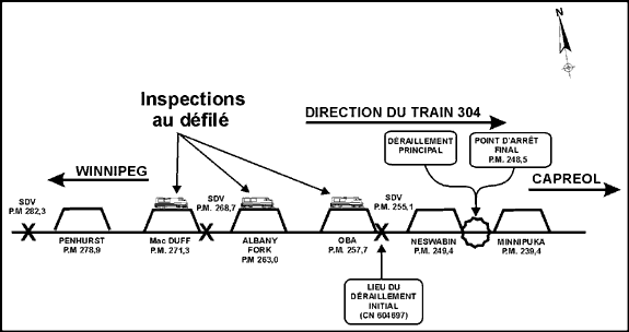 Entre le terminal initial de Hornepayne et l'endroit où est survenu le déraillement, soit une distance d'environ 41 milles, le train 304 avait été inspecté par les équipes de trois autres trains arrêtés dans les trois voies d'évitement qui précédaient le lieu du déraillement (voir la figure 5). Le train 304 n'a été inspecté que du côté nord à ces trois endroits. En raison des conditions d'enneigement, il y avait peu d'endroits sûrs où les employés pouvaient se placer pour inspecter un train au défilé du côté sud de la voie. Aucun défaut n'a été relevé lors de ces inspections.