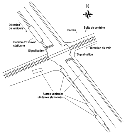 L'accident s'est produit avant le début des travaux, pendant qu'un véhicule était stationné du côté nord-ouest du passage à niveau et que les travailleurs se réunissaient du côté sud pour une séance d'information. Pour les automobilistes, les signaux disponibles étaient moins évidents à cause de toute cette activité et aucune mesure additionnelle n'a été prise pour assurer leur sécurité de marche dans cette zone.