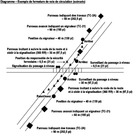 - deux signaleurs additionnels (« surveillants du passage à niveau »), à la solde de 360, doivent prendre position à au moins 21 pieds (7 mètres) de la voie ferrée, des deux côtés du passage à niveau;