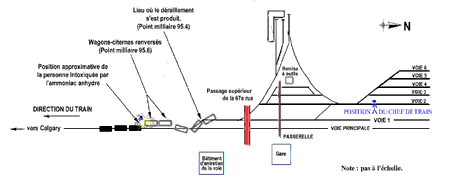 Le 2 février 2001 vers 20 h 23, on préparait le train no CP 966-02 du Chemin de fer Canadien Pacifique en vue de son départ du triage Red Deer. Au cours des préparatifs, le train roulait vers le sud à une vitesse d'environ 3,9 mi/h quand un freinage d'urgence s'est déclenché, causant l'immobilisation du train. Cinq wagons-citernes chargés d'ammoniac anhydre avaient déraillé au point milliaire 95,4 de la subdivision Red Deer. Deux des wagons-citernes déraillés se sont renversés, et 71,74 tonnes (le chargement complet) d'ammoniac anhydre se sont échappées d'un des wagons renversés. En raison du déversement, il a fallu faire évacuer les habitants du secteur ainsi que les occupants des commerces voisins, soit quelque 1 300 personnes. Trente-quatre personnes ont été admises à l'hôpital de Red Deer, où elles ont reçu des traitements appropriés au niveau d'exposition, après quoi elles ont pu quitter l'hôpital. Une personne a perdu la vie après avoir été intoxiquée par des vapeurs d'ammoniac anhydre pendant qu'elle traversait l'emprise du chemin de fer.