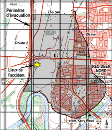 À 20 h 40, la Gendarmerie royale du Canada établit un périmètre de sécurité, bloque tous les accès routiers aux lieux du déraillement et aide à faire évacuer les résidents des environs. Le 3 février 2001 vers 6 h, la ville de Red Deer établit un centre des opérations d'urgence. À 8 h 30, la ville de Red Deer déclare l'état d'urgence en raison de la fuite d'ammoniac anhydre du wagon-citerne, et à 9 h, les responsables établissent le périmètre d'évacuation. Tous les habitants de la zone d'évacuation et les occupants des commerces voisins, soit quelque 1 300 personnes sont évacuées. L'ordre d'évacuation reste en vigueur pendant environ 37 heures et demie. Personne n'a été blessé pendant l'évacuation. La figure 3 montre les lieux du déraillement et la zone qui a été évacuée.