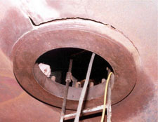 Le rapport no LP 009/2001 du Laboratoire technique du BST indique que la buse du trou d'homme du wagon-citerne PROX 88421 a été soumise à une surcharge considérable au moment du déraillement et du renversement du wagon et qu'elle a alors subi une rupture fragile qui a laissé une ouverture d'environ 5,125 pouces carrés dans la zone affectée thermiquement de la soudure entre la buse du trou d'homme et les parois de la citerne (figure 7). Le wagon a aussi subi une rupture par cisaillement du métal près de la longrine; cette rupture a été attribuée à une petite précrique localisée dans la soudure entre la longrine et la plaque, du côté extérieur de la longrine. Vu que l'ammoniac s'est répandu graduellement dans l'atmosphère, il ne s'est pas formé de gros nuage de gaz au moment de l'accident. De l'ammoniac liquide s'échappait encore lentement du wagon, 24 heures après l'accident.