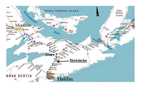Dans la subdivision Bedford, la voie principale est simple. La vitesse autorisée par l'indicateur est de 75 milles à l'heure (mi/h) pour les trains de voyageurs et de 60 mi/h pour les trains de marchandises. Un ordre temporaire limitait la vitesse à 50 mi/h au passage à niveau de la rue Main situé au point milliaire 46,75, dans la ville de Stewiacke. Dans le secteur du déraillement, la voie était faite de longs rails soudés de 115 livres, laminés et posés en 1989. Les rails reposaient sur des traverses de bois dur no1, ils étaient fixés à chaque traverse par quatre à six crampons et reposaient sur des selles de 14 pouces à double épaulement. Le ballast de pierre concassée était en bon état.