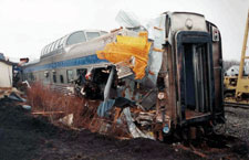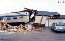 Le 12 avril 2001, vers 14 h 24, heure avancée de l'Atlantique (HAA)Note de bas de page 1, le VIA 15, un train de voyageurs de VIA Rail Canada Inc. (VIA) comptant deux locomotives et 14 voitures, a déraillé au point milliaire 46,45 de la subdivision Bedford du Canadien National (CN) alors qu'il roulait en direction ouest. Le déraillement s'est produit à la hauteur d'un aiguillage de voie principale à manœuvre manuelle, désigné comme étant l'aiguillage TU-29, dans la ville de Stewiacke (Nouvelle-Écosse), à environ 70 kilomètres au nord de Halifax. Les deux locomotives et les deux premières voitures du VIA 15 ont continué sur la voie principale, mais les voitures suivantes ont bifurqué et se sont engagées dans la voie industrielle TU-29. Neuf voitures, de la 3e à la 11e, ont déraillé. Une voiture, la Skyline, a heurté les fondations d'un immeuble abritant un commerce de fournitures agricoles et a subi des dommages considérables. La partie centrale de la voiture suivante, une voiture-restaurant, s'est effondrée; pliée autour de l'immeuble à un angle d'environ 90 degrés, la voiture a été complètement détruite ainsi que l'immeuble (figure 2 et figure 3). Quatre occupants de l'immeuble ont quitté les lieux avant l'impact sans être blessés. Le train transportait 132 personnes.