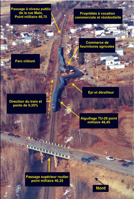 Le déraillement est survenu entre un passage supérieur routier situé au point milliaire 46,35 et un passage à niveau public (muni de feux clignotants et d'une cloche d'avertissement) situé au point milliaire 46,75 (figure 6). Même si le train à été désigné comme circulant en direction ouest, la voie est orientée dans l'axe nord/sud à cet endroit. La voie est en alignement droit et descend une pente de 0,35 p. 100. Un aiguillage pour une voie industrielle (TU-29) se trouvait au point milliaire 46,45. La voie industrielle était munie d'un dérailleur destiné à protéger la voie principale contre les mouvements intempestifs du matériel roulant. Un parc clôturé se trouvait à l'ouest des voies ferrées, et il y avait des propriétés à vocation commerciale et résidentielle du côté est de la voieprincipale. Le dernier signal intermédiaire (signal H443) avant l'aiguillage TU-29 était situé au point milliaire 44,3. Un système de détection en voie (SDV) se trouvait aussi à cet endroit.