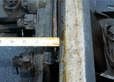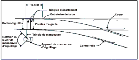 La voie TU-29 était reliée à la voie principale par un branchement no 10 conçu pour une vitesse de 15 mi/h. La distance entre la pointe et le talon de l'aiguille était de 16,5 pieds (figure 7).Les enquêteurs ont remarqué que l'extrémité de la pointe d'aiguille la plus rapprochée de l'appareil de manœuvre était légèrement écrasée et qu'elle montrait des marques récentes. Ils ont aussi remarqué une légère courbure de l'extrémité de la pointe d'aiguille, près du talon. Le contre-rail de la voie principale, du côté opposé au cœur de croisement, était endommagé par des impacts de roues et était tordu en direction de la voie industrielle. On a relevé des marques sur le patin du rail, sur les traverses et sur le ballast, entre le cœur de croisement et la position de la première voiture déraillée. La voie n'était pas endommagée jusqu'à l'emplacement du cœur de croisement.