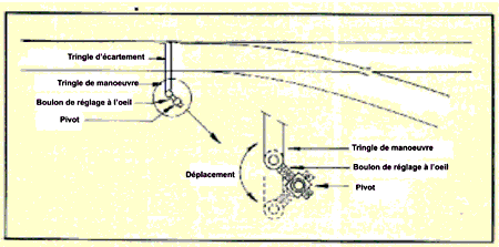 La cible et les voyants de nuit de l'aiguillage sont fixés directement au mât de l'appareil de manœuvre d'aiguillage. Le mât de l'appareil de manœuvre est relié à un pivot et au levier de manœuvre d'aiguillage (figure 14). Donc, il y a une relation directe entre le déplacement latéral du levier de manœuvre et le changement d'aspect de la cible et du mât d'aiguillage.