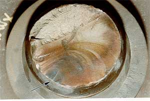 Les morceaux de l'essieu ont été envoyés au Laboratoire technique du Bureau de la sécurité des transports du Canada (BST) pour fins d'analyse. L'examen (rapport no LP 11/01) a révélé la présence d'une fissure de fatigue qui couvrait plus de 65 % de la surface de rupture (voir la photo 3). La fissure s'était manifestée d'abord dans des foyers multiples du congé de raccordement de la fusée d'essieu et de l'obturateur de boîte d'essieu (le congé de raccordement de la fusée d'essieu) et coïncidait avec les piqûres de corrosion. Les surfaces de fracture étaient fortement oxydées, mais il n'y avait pas de signe de surchauffe sur les composantes. Selon la base de données du BST, sept ruptures d'essieu se sont produites au Canada dans des circonstances similaires à cet accident entre 1998 et 2000 (cassure de l'essieu due à la présence d'une fissure de fatigue qui coïncidait avec des piqûres de corrosion).Note de bas de page 3