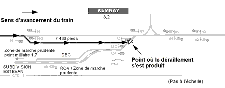 Dans la subdivision Broadwiew, la circulation ferroviaire est régie grâce au système de commande centralisée de la circulation (CCC) en vertu du Règlement d'exploitation ferroviaire du Canada (REF), et elle est supervisée par un contrôleur de la circulation ferroviaire (CCF) posté à Calgary (Alberta). Dans le secteur du déraillement, la voie principale est simple et elle est parallèle à une voie d'évitement de 7 430 pieds de longueur, située au sud de la ligne principale. La subdivision Estevan rejoint la voie d'évitement Kemnay à un aiguillage de jonction situé à l'extrémité est de la voie d'évitement, à environ 285 pieds à l'ouest de l'aiguillage de jonction reliant la voie principale et la voie d'évitement. Les deux aiguillages se trouvent dans l'ensemble d'aiguillages de branchement à distance no 13. La voie descend une pente de 0,25 p. 100 d'ouest en est.