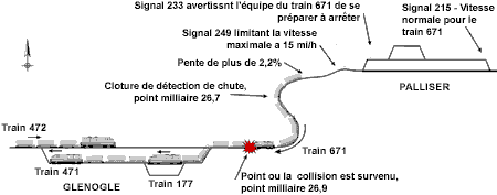 Aux environs du point milliaire 26,9, la voie principale est simple et descend une pente raide ponctuée de nombreuses courbes qui limitent la visibilité vers l'avant, ce qui fait que la conduite de trains de fort tonnage s'avère difficile dans le secteur. Entre le signal 249 et le point où le déraillement s'est produit, l'inclinaison de la pente change fréquemment et varie de 2,20 % à 0,95 %. La vitesse autorisée dans cette section de la subdivision est de 25 mi/h pour les trains de voyageurs et de 20 mi/h pour les trains de marchandises. Quand le signal 249 montre une indication de marche à vue, la vitesse entre le point milliaire 25,0 et le point milliaire 27,3 est limitée à 15 mi/h, ou à une vitesse inférieure qui permet d'arrêter en deçà de la moitié de la distance de visibilité. Les calculs du BST ont permis de déterminer que, pour que le train puisse s'arrêter en deçà de la moitié de la distance de visibilité (210 pieds), sa vitesse ne devait pas excéder 9,5 mi/h, et que la distance de freinage pour le train 671 roulant à 17 mi/h serait d'environ 540 pieds.