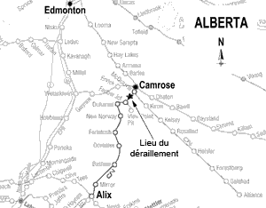 Le 8 juillet 2002, le train de marchandises A-442-51-08 (le train) du Canadien National (CN) part d'Edmonton (Alberta) à destination de Calgary (Alberta) vers 10 h 40, heure avancée des Rocheuses (HAR)Note de bas de page 1. La figure 1 montre une carte du secteur. Le train se compose de 146 wagons chargés, de 6 wagons vides et de 2 wagons-citernes contenant des résidus de gaz de pétrole liquéfié (UN 1075). Le groupe de traction est constitué de trois locomotives de traction, en l'occurrence des locomotives General Motors (GM) de modèles SD60, SD70 et SD75 respectivement, disposant toutes les trois du freinage rhéostatique à effet prolongé. Le train compte aussi deux locomotives GM isolées de modèle GP 9, qui suivent les locomotives de traction. Le train pèse 17 201 tonnes et mesure 9 708 pieds. Le train passe devant deux détecteurs de boîtes chaudes et de pièces traînantes en cours de route, lesquels ne signalent aucune anomalie. Les deux locomotives isolées ne sont pas munies d'attelages à dispositif de centrageNote de bas de page 2.