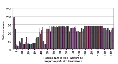 - les wagons qui précèdent les locomotives sont vides ou qu'ils sont de longueur variable (wagons longs, wagons courts).