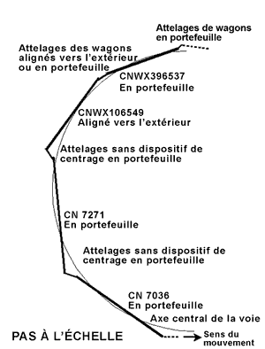- Les attelages entre la locomotive menée, CN 7271, et le premier wagon-trémie couvert, CNWX 106549, étaient en position de mise en portefeuille, ce qui a accentué l'effort latéral transformé (figure 6).