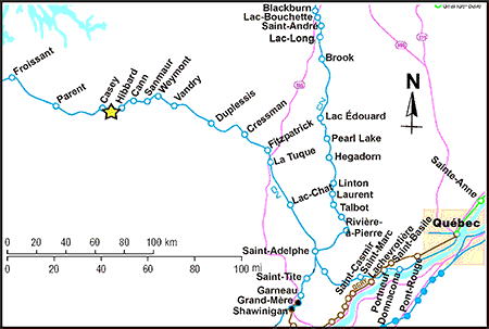 La subdivision Saint-Maurice s'étend sur une distance de 257,2 milles entre Fitzpatrick (Québec) et Senneterre (Québec). Le mouvement des trains est régi par la régulation de l'occupation de la voie (ROV) en vertu du Règlement d'exploitation ferroviaire du Canada (REF), sous la surveillance d'un contrôleur de la circulation ferroviaire posté à Montréal (Québec). La voie principale se compose d'une voie simple et est orientée dans l'axe est-ouest. Dans le secteur de l'accident, la voie est de catégorie 3 selon le Règlement sur la sécurité de la voie (RSV) de Transports Canada et la vitesse maximale permise est de 50 mi/h pour les trains de voyageurs et de 40 mi/h pour les trains de marchandises. Le poids maximal autorisé des wagons est de 286 000 livres et le tonnage cumulatif annuel acheminé est d'environ 6,7 millions de tonnes.