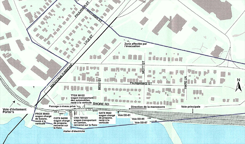 Le 15 février 2002 vers 9 h 55, heure normale de l'Atlantique (HNA)Note de bas de page 1, alors que la manoeuvre de triage no 0700 du Canadien National (CN) va s'arrêter après avoir tiré 15 wagons en direction ouest, un freinage d'urgence provenant de la conduite générale se déclenche. L'inspection faite ultérieurement par les trois membres de l'équipe révèle que le wagon-citerne no PROX 98403 (un wagon-citerne chargé de butane qui est attelé à la locomotive) a déraillé mais est resté à la verticale; les membres de l'équipe constatent aussi que le wagon-citerne suivant, no CGTX 64098 (chargé de propane) s'est renversé sur le flanc en direction de la lisière du port, que le wagon plat no CNA 750123 (transportant un camion) s'est renversé sur le côté et a failli heurter un atelier d'électricité situé au sud de la voie de triage; que le wagon plat no TTGX 98122 (transportant des automobiles) a déraillé mais est resté à la verticale et bloque un passage à niveau privé; et que le wagon-citerne no GATX 9642 (chargé de propane) a déraillé mais est resté à la verticale du côté est du passage à niveau privé (figure 2).
