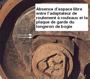 Le wagon no CGTX 64098, le deuxième wagon à dérailler, était un wagon-citerne sous pression construit d'après la spécification DOT 112J340W. Il pouvait transporter une charge maximale de 158 900 livres et avait été construit en septembre 1970. Il était équipé de bogies Barber S-2, de roues de 36 pouces de diamètre et de roulements à rouleaux de 6½ pouces sur 12 pouces. Les bogies étaient munis de ressorts de type D-3 dont le débattement est de 2½ pouces et les rend plus rigides que ceux de certains wagons dont les ressorts ont un débattement plus grand (p. ex. les ressorts D-5 ayant un débattement de 3¾ pouces). Il y avait des marques polies sur la crapaudine du bogie avant, à l'endroit où la portion supérieure était en contact avec la pièce moulée du pivot de caisse. Ces marques n'étaient pas dues à la courte distance que le wagon avait parcourue après avoir déraillé. D'après les normes de l'Association of American Railroads (AAR), les wagons doivent avoir un dégagement minimum de 1/16 de pouce à cet endroit. Il n'y avait pas d'espace libre visible entre les adaptateurs des roulements à rouleaux et les plaques de garde des longerons du bogie avant et, à un endroit, sur le bogie arrière (photo 3) à cause de l'usure de l'adaptateur de roulements à rouleaux ou du longeron de bogie. La dernière inspection de sécurité du wagon a été faite par un inspecteur de wagons autorisé le 12 février 2002, pendant que le wagon faisait partie du train no CN 454 à Moncton (N.-B.). Aucun défaut n'a été relevé à ce moment.