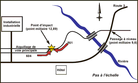 Vers 2 h 55, pendant que son train roule en direction ouest à 20 milles à l'heure (mi/h), l'équipe du train 861 constate que le train 604 obstrue la voie principale à l'extrémité ouest de la voie d'évitement de Natal, et commande un serrage d'urgence des freins du train. Le côté du train 861 heurte le train 604 au point milliaire 12,89 à une vitesse d'environ 14 mi/h. Après avoir heurté le train 604 et l'avoir poussé sur une distance de 53 pieds, le train 861 s'immobilise en une centaine de pieds. Le chef de train subit des blessures mineures par suite de la collision. Il n'y a personne à bord du train 604 au moment de la collision (la figure 1 montre un schéma représentant les lieux de la collision).