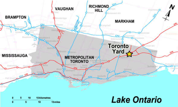 Le triage Toronto est une cour de triage où le classement des wagons de marchandises est automatisé. Le CFCP exploite trois triages similaires, à Calgary, Chicago et St. Paul. Ce sont des installations de triage typiques qu'on trouve un peu partout en Amérique du Nord.