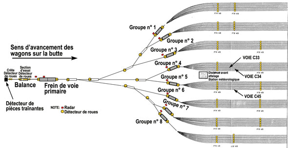 À leur arrivée, les trains sont dirigés vers un faisceau de réception où l'on dételle les locomotives pour les envoyer vers les ateliers d'entretien. On remorque ensuite les groupes de wagons reçus pour les faire sortir du faisceau de réception et on les dételle manuellement. Pour faciliter la formation des trains de départ, on a équipé le triage Toronto de systèmes informatisés et de matériel spécialisé permettant de répartir automatiquement les wagons d'après leur destination. Les wagons chargés et vides sont passés sur la butte, puis dirigés vers leur voie de classement désignée. Au triage Toronto, qui dispose d'une seule butte, la capacité de triage est de quelque 1300 wagons par jour. Le triage Toronto compte 72 voies de classement réparties en huit groupes de neuf voies (voir la figure 2). Une fois les wagons sortants passés sur la butte, les groupes de wagons triés sont extraits de la voie de classement et déplacés vers le faisceau de départ. Dans le faisceau de départ, on réunit le train qui va partir avec les locomotives revenues des ateliers d'entretien.