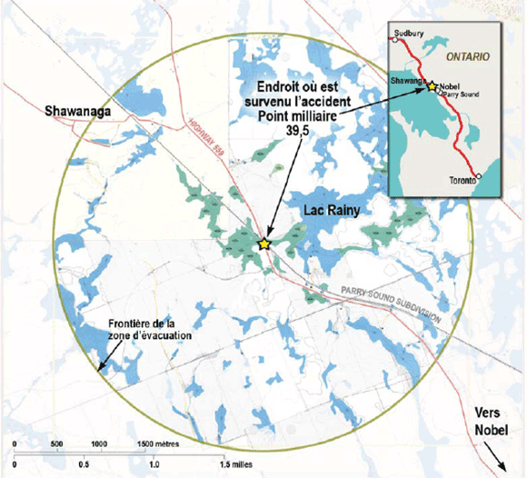 Pendant son inspection, l'agent de police rencontre le chef de train, et celui-ci l'informe qu'il y a une fuite de MD et qu'il devrait quitter les lieux. L'agent de police s'éloigne alors d'environ 800 m vers le nord-est, au vent par rapport au lieu de l'accident, où l'odeur est encore perceptible. Le Guide nord-américain des mesures d'urgence suggère qu'un déversement considérable de ces produits devrait entraîner une évacuation dans un rayon de 300 m (1 000 pieds) en aval du lieu de l'accident par rapport au vent. Après des discussions entre l'agent de police et le chef de la bande de la Première nation de Shawanaga, on décide d'évacuer le secteur de l'accident dans un rayon de 2,5 km. L'ordre d'évacuation, qui touche 180 personnes et inclut le village de Shawanaga, débute à 10 h 30 le 13 février 2003 et reste en vigueur pendant 54 heures. Au cours de cette période, les évacués se sont dits préoccupés par l'absence de communications de la part des représentants de la compagnie de chemin de fer. Le service des incendies local, la police provinciale de l'Ontario (OPP) et d'autres organismes de réglementation provinciaux et fédéraux se rendent sur les lieux de l'accident pendant l'intervention.