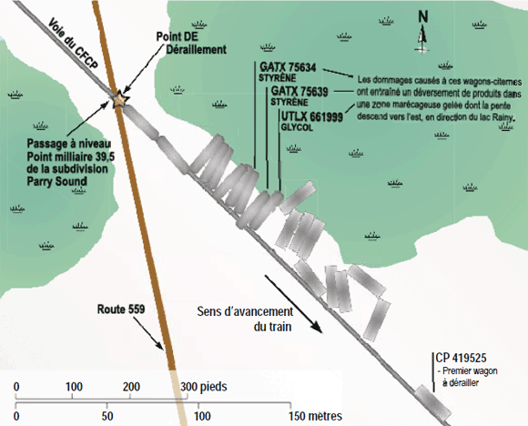 Le premier wagon à dérailler a été le CP 419525, un wagon plat qui transportait des essieux montés de wagons de marchandises. Ce wagon, resté attaché à la partie avant du train, est resté à la verticale même si toutes ses roues ont quitté la voie. Les 20 wagons déraillés suivants sont séparés de l'avant du train par une trouée d'environ 500 pieds (150 m). Dix-huit de ces wagons se sont arrêtés dans différentes positions à l'est de la voie et un peu au sud du passage à niveau public de la route 559, point milliaire 39,5 (voir la figure 2). La voie ferrée a été endommagée sur une distance d'environ 430 pieds (130 m).
