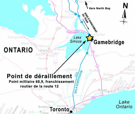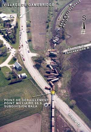 Le 21 mai 2003 à 11 h 44, heure avancée de l'Est, 49 wagons du train A-450-31-21 du Canadien National (CN), qui roulait en direction sud à destination de Toronto (Ontario) après être parti de North Bay (Ontario), ont déraillé au sud du passage à niveau de la route 12, dans le village de Gamebridge (Ontario), au point milliaire 68,9 de la subdivision Bala du CN. Le déraillement a touché 21 wagons-citernes chargés d'acide sulfurique, 2 wagons couverts vides et 26 wagons couverts chargés de papier.