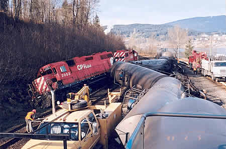 Le 5 février 2003 à 0 h 40, heure normale du Pacifique, 7 wagons-citernes chargés de glycol ont déraillé alors que le train de marchandises 771-009 du Chemin de fer Canadien Pacifique roulait vers l'ouest sur la voie G-5 desservant les terminus de la côte du Pacifique, à Port Moody (Colombie-Britannique). Les wagons déraillés se sont mis en portefeuille dans l'axe nord-sud et ont obstrué les tronçons nord et sud de la voie principale au point milliaire 116,95 de la subdivision Cascade. Un second train, la manœuvre RS-8, qui roulait en direction est sur le tronçon sud de la voie principale, est entré en collision avec deux des wagons déraillés. Deux wagons-citernes ont été percés et ont laissé échapper environ 14 000 gallons (64 000 litres) de glycol, dont la plus grande partie s'est répandue dans le bras de mer Burrard. Le déraillement s'est produit dans une zone industrielle. L'accident a causé des blessures mineures aux membres de l'équipe de la manœuvre RS-8 et il a eu des répercussions minimes sur l'environnement.