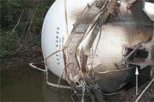 Il n'y a eu rien d'inhabituel dans la conduite du train. L'équipe a suivi la procédure d'urgence. Le chef de train a inspecté la queue du train et a déterminé que 10 wagons, du 54e au 63e à partir de la tête du train, avaient déraillé dans une courbe à gauche dans le sens d'avancement du train. Neuf des dix wagons déraillés étaient des wagons-citernes sous pression chargés de gaz de pétrole liquéfié (classe 2.1, UN 1075). L'autre wagon déraillé était un wagon couvert chargé de produits de papier. Huit des wagons-citernes chargés de gaz de pétrole liquéfié se sont renversés sur le côté ou se sont renversés sens dessus dessous (photos 1 et 2). Conformément aux directives de la compagnie, l'équipe a immédiatement signalé l'accident au bureau de la CBNS à Stellarton et au bureau du contrôle de la circulation ferroviaire situé à North Bay (Ontario). Le contrôleur de la circulation ferroviaire (CCF) a avisé un gestionnaire des opérations de la CBNS à Stellarton, le BST à Gatineau (Québec) et CanutecNote de bas de page 3 à Ottawa (Ontario)Note de bas de page 4.