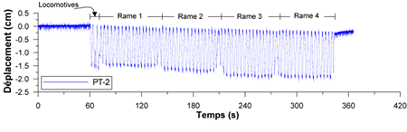 Lors du passage des trains, des valeurs maximales de déplacement vertical instantané de 2,0 à 2,5 cm et des augmentations de pressions interstitielles de 5 à 20 kPaNote de bas de page 6 ont été enregistrées selon les différents points de mesure. Les déplacements moyens et les pressions interstitielles moyennes ont tendance à augmenter avec le nombre de wagons qui passent, ce qui crée une accumulation en fin de passage du train. Après le passage du dernier wagon, les surpressions interstitielles se dissipent progressivement; cependant, des tassements résiduels de l'ordre de quelques dixièmes de millimètres subsistent (voir l'annexe A).