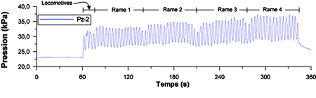 Le passage répété des trains engendre des pressions interstitielles qui sont maximales au centre de la couche de tourbe. Les résultats indiquent que l'intensité des surpressions interstitielles dépend de la charge des essieux et de la vitesse de passage des trains. Les données enregistrées par les piézomètres électriques de grande précision à des vitesses de 5, 10 et 15 mi/h permettent d'estimer que les surpressions interstitielles dans la tourbe pour une vitesse de passage de 38 mi/h seraient d'environ 25 kPa.