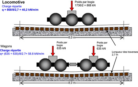 Les sollicitations moyennes transmises par un train chargé ont été estimées en tenant comme acquis que les charges des groupes d'essieux se répartissent sur une longueur d'environ 8 m. Pour la locomotive, la contrainte verticale équivalente appliquée sous les traverses est alors de 40,2 kPa et pour les wagons, cette contrainte est de 58,8 kPa (voir l'annexe C1).