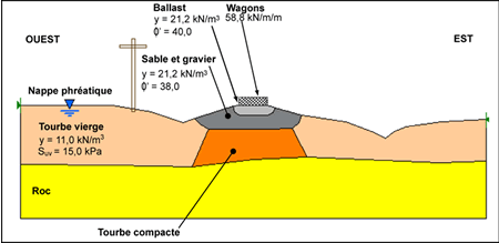 - Une évaluation conservatrice des risques de glissement de pente démontre que le remblai de la voie ferrée construit sur le dépôt de tourbe est stable vis-à-vis un glissement de pente sous les charges des wagons et locomotives.
