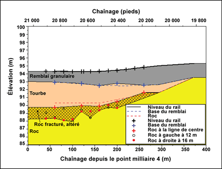Plusieurs campagnes de forages, effectuées entre les points milliaires 4,2 et 3,75, ont permis d'établir le profil stratigraphique le long de la ligne de centre de la voie ferrée et de mettre en place l'instrumentation requise pour les systèmes d'acquisition en continu des données visant à mesurer les variations de pression d'eau interstitielle et la déformation verticale causée par la pression dans le sol. Le profil stratigraphique le long de la ligne de centre de la voie ferrée a été établi tel que présenté à la figure 2 alors que la figure 3 montre la coupe transversale de la voie ferrée. Le socle rocheux se trouve à des profondeurs comprises entre 3 et 5 m. Il s'agit d'un schiste brun rougeâtre à gris verdâtre, fracturé et très friable. Le niveau de la nappe phréatique est à environ 1,0 m sous la voie ferrée et se situe dans la couche de remblai.